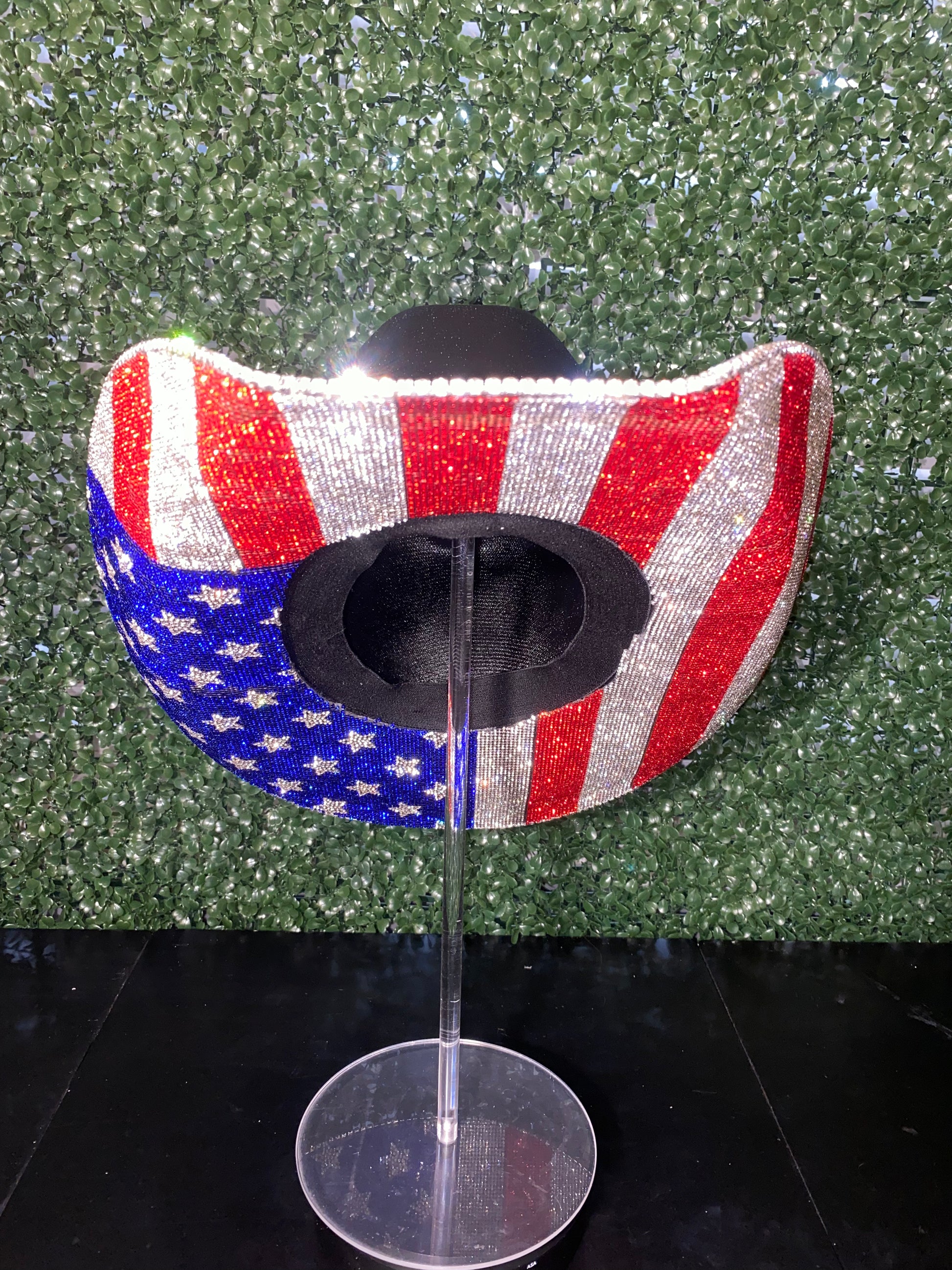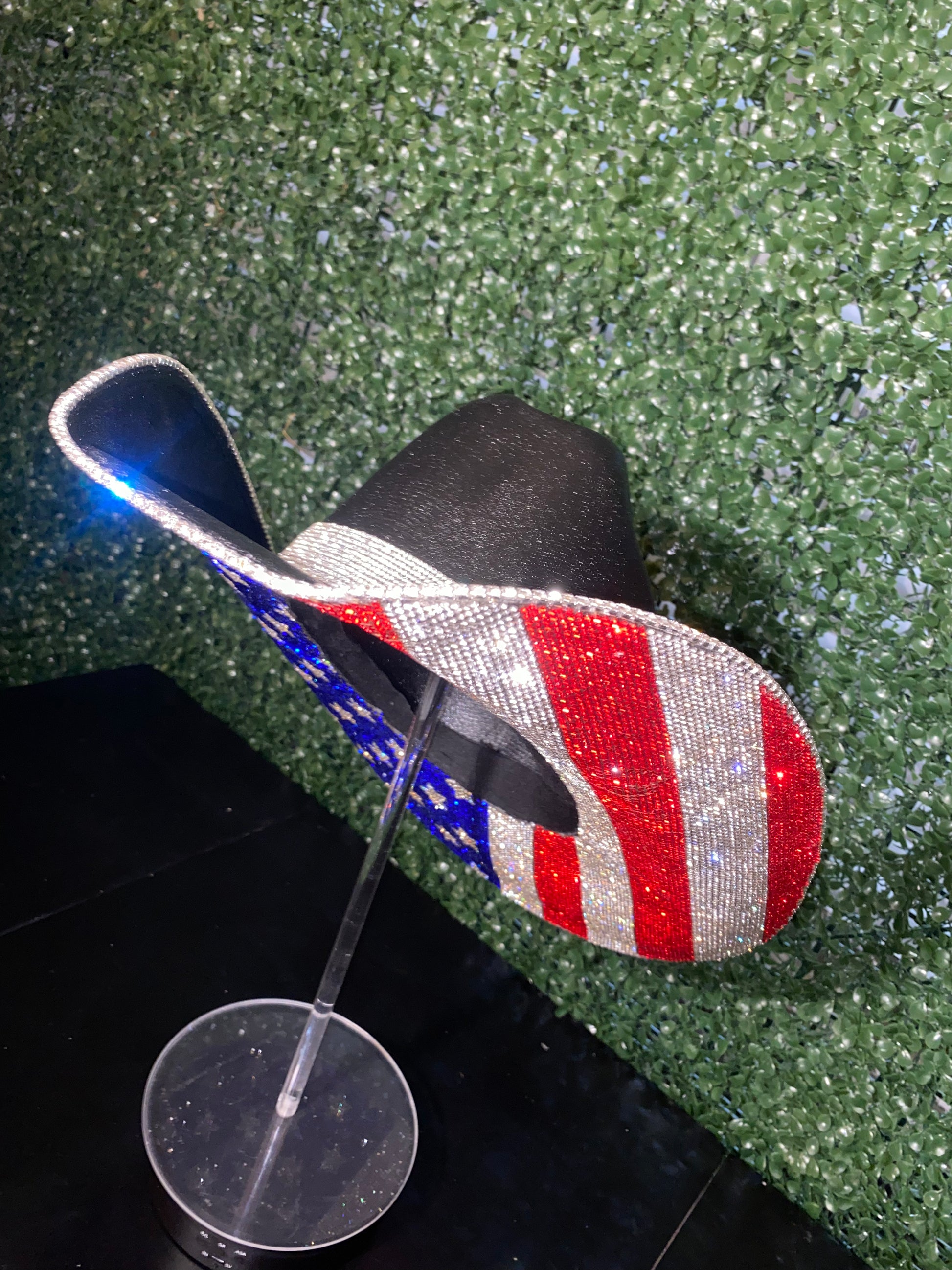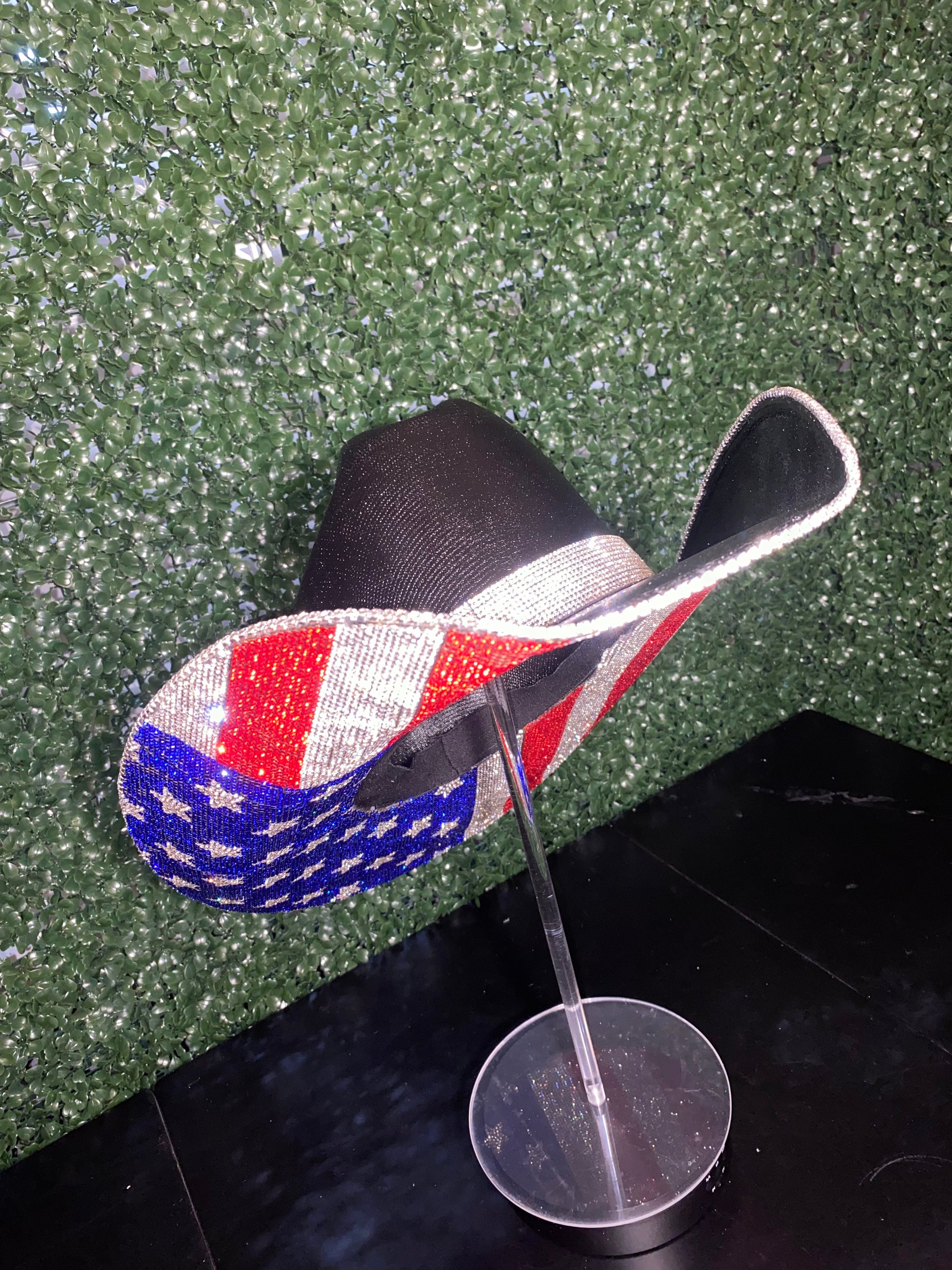 - Custom rhinestoned American Flag on the bottom brim ONLY