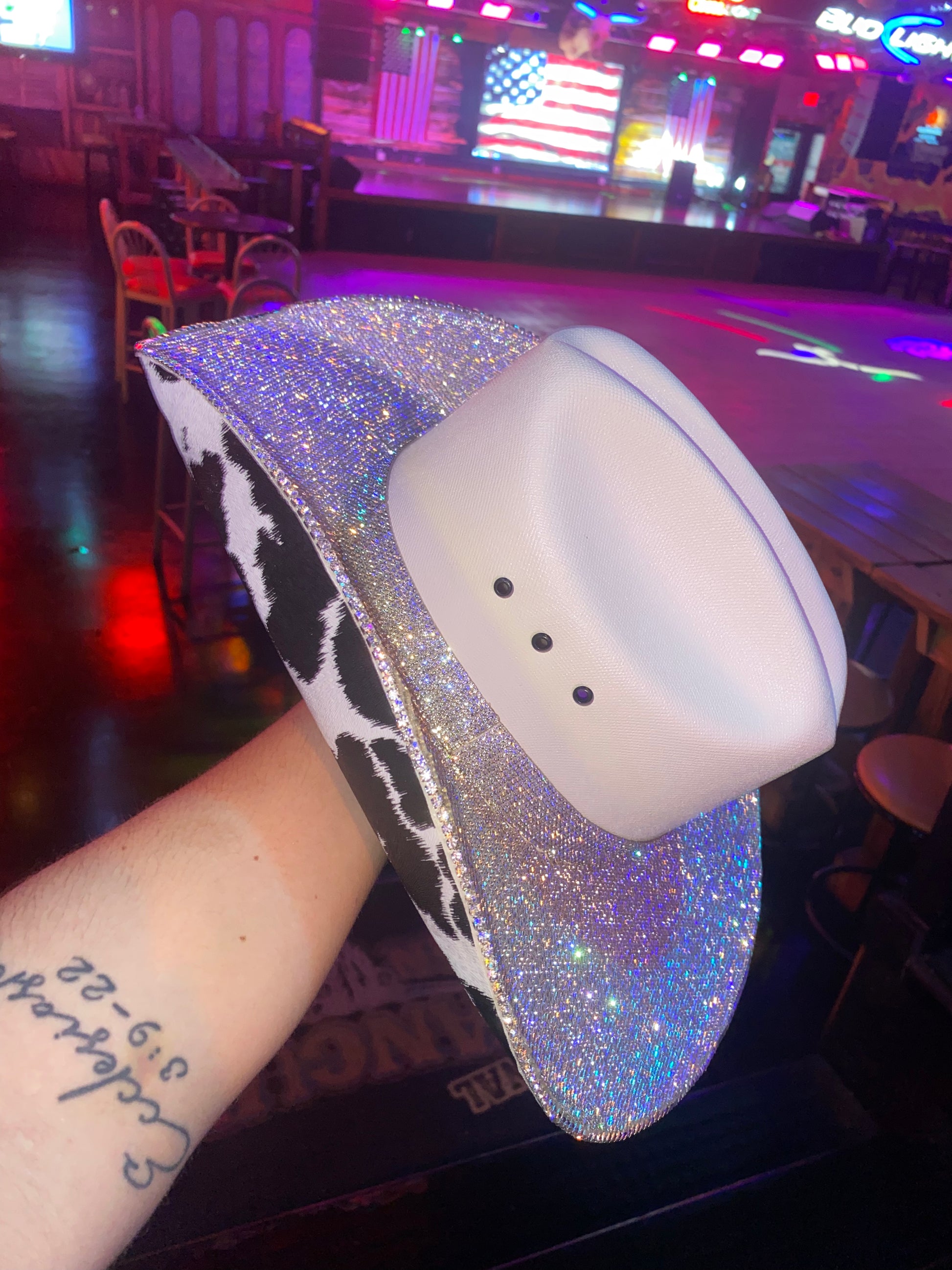 - B&W cow print on the bottom brim (PLEASE NOTE the cow print is NOT rhinestoned)